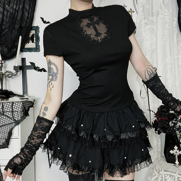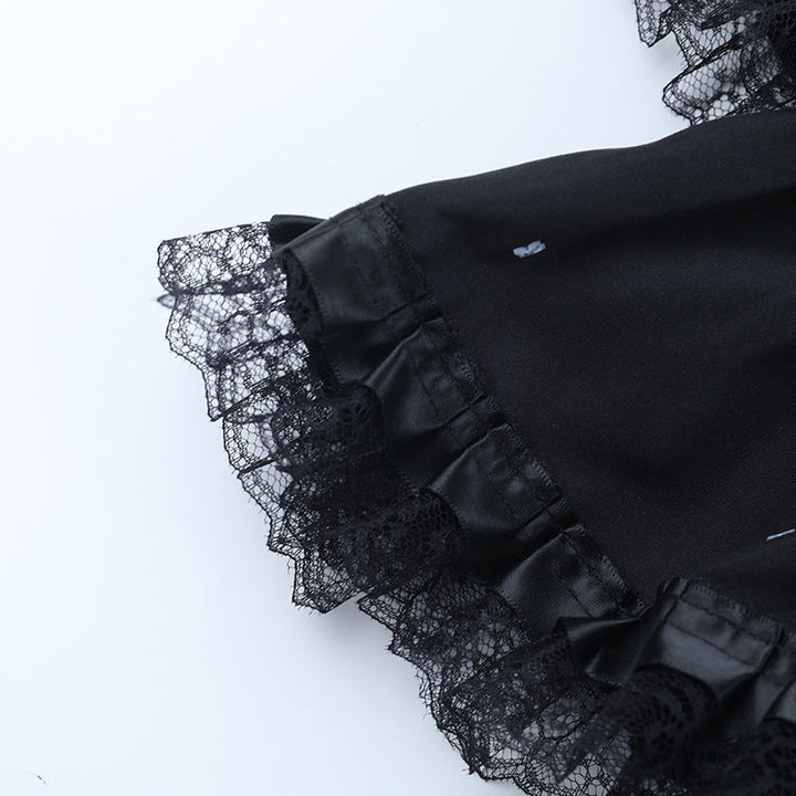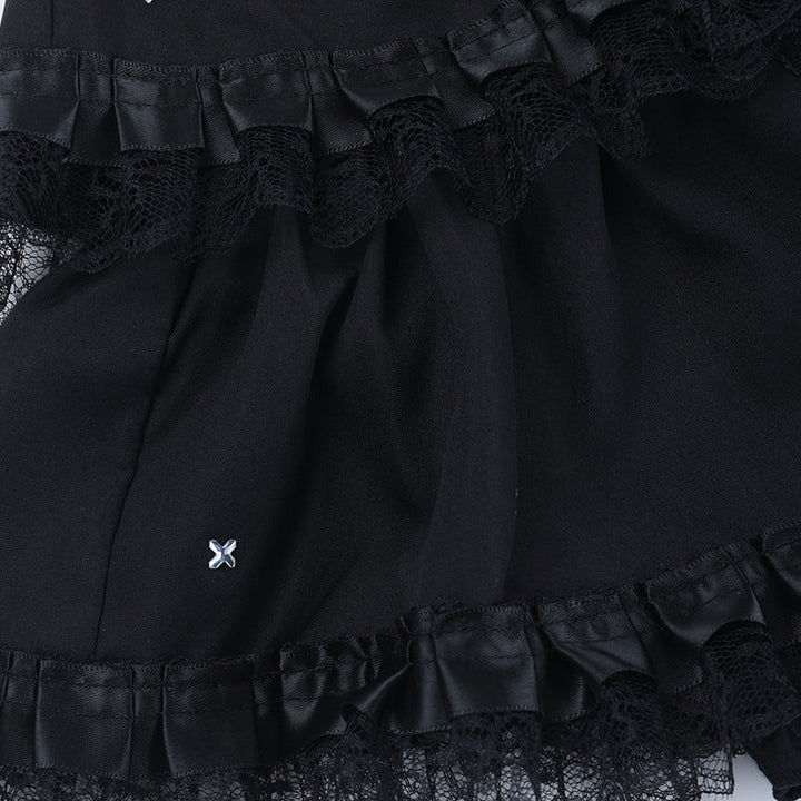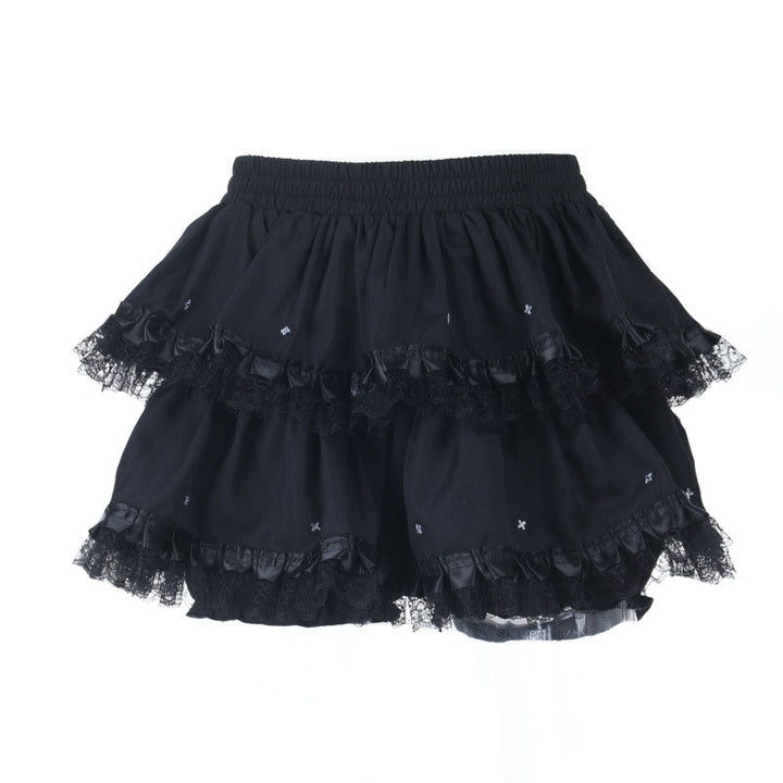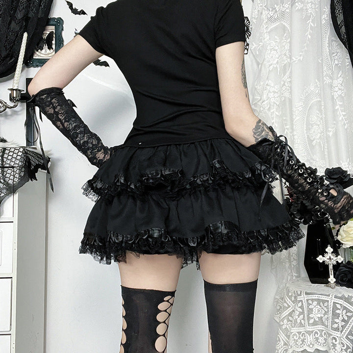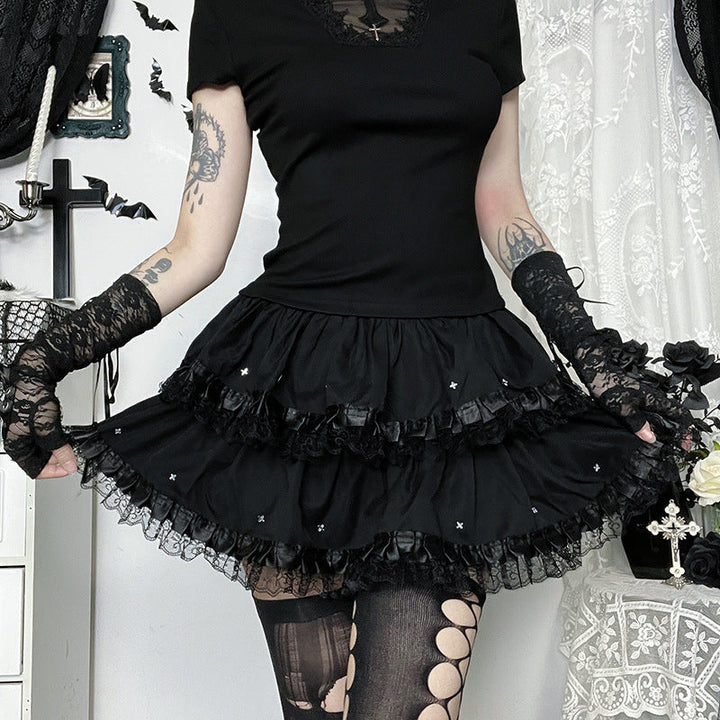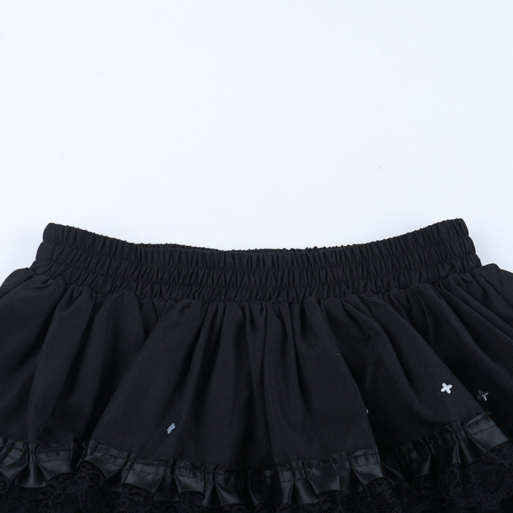 Ruched lace hem A line black mini skirt