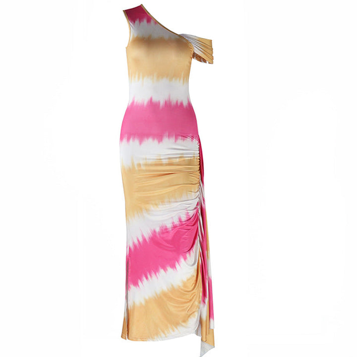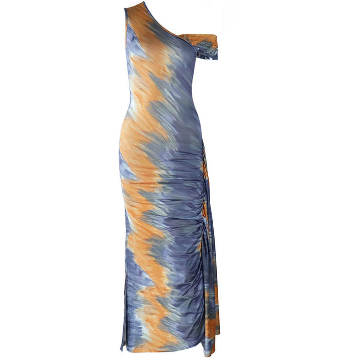 Ruched one shoulder print irregular maxi dress