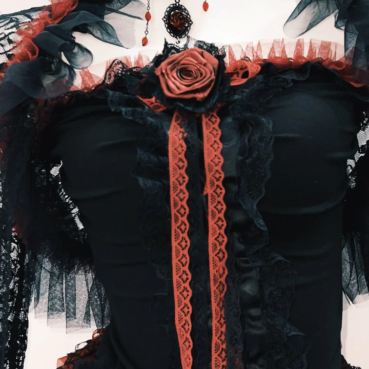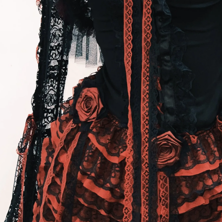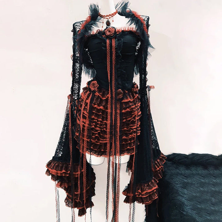 Ruffle long flared sleeve lace flower applique mini skirt set