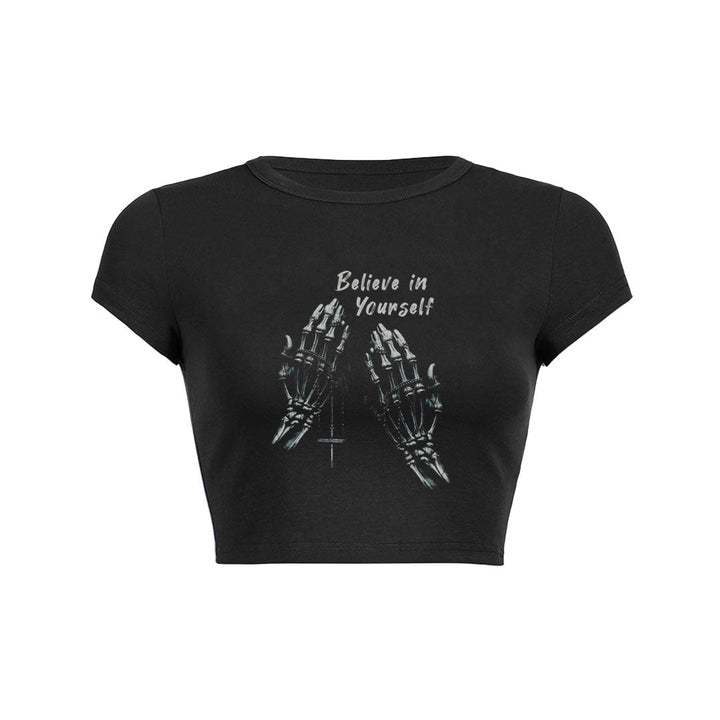 Skeleton Hands Believe Graphic Crop Top Baby Tee