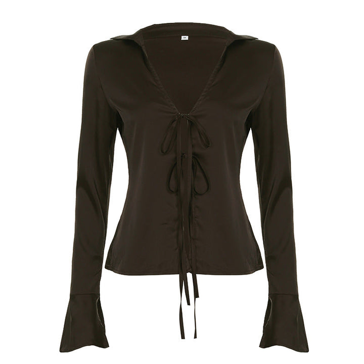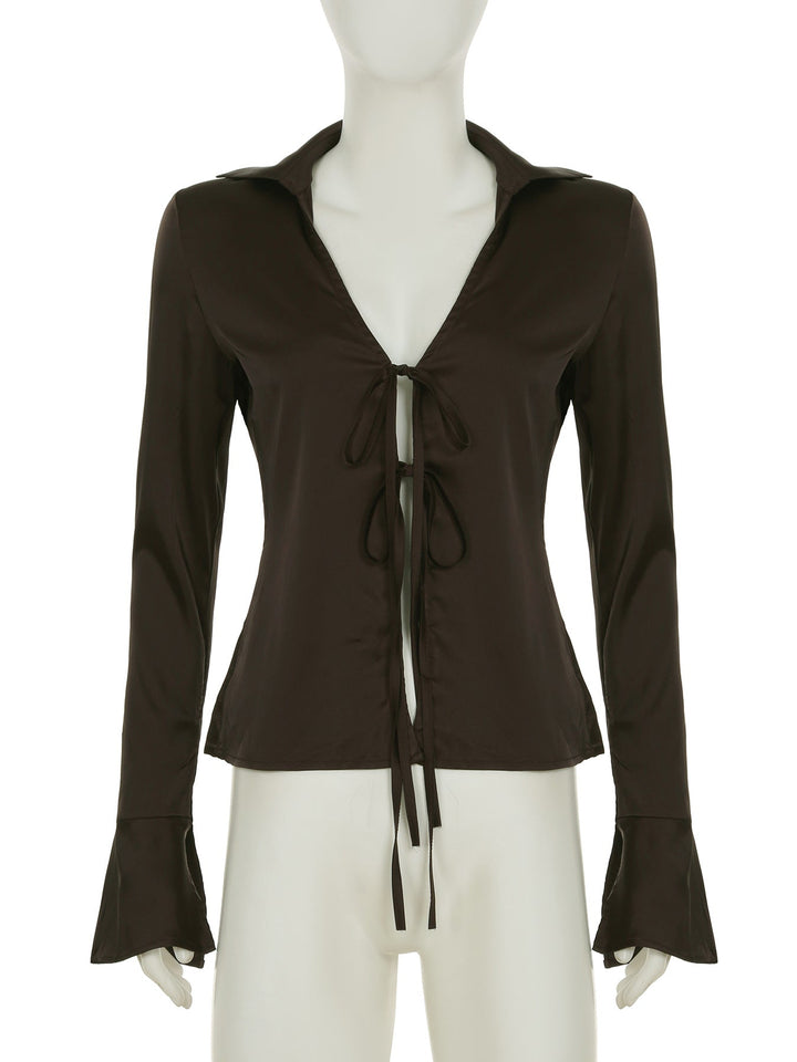 Turnover collar long flared sleeve self tie top